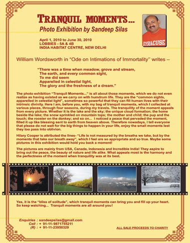 The two solo photographic exhibitions by Sandeep — Orchids and Faces, India Habitat Centre, New Delhi (March 21, 2009 to August 20, 2009) and Tranquil Moments, India Habitat Centre, New Delhi (April 1, 2010 to August 20, 2009) have been much appreciated for their sensitivity, exuberance and immortal appeal. These have been described by art lovers as “living paintings”.